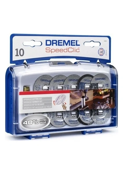 Dremel Speedclic Kesme Seti 10 EZ SpeedClic kesme diski ve özel EZ SpeedClic mandreninin çeşitlendirmesi. 6 normal 38 mm metal kesme diskinin yanında kit, 2 özel ince kesme diski ve 2 eşsiz plastik kesme diski içerir. EZ SpeedClic, çok amaçlı el aleti aksesuarları için benzersiz hızlı değiştirme sistemidir. EZ SpeedClic. Hızlı, kolay, anahtarsız. 10 EZ SpeedClic kesme diski ve özel EZ SpeedClic mandreninin çeşitlendirmesi. 6 normal 38 mm metal kesme diskinin yanında kit, 2 özel ince kesme diski ve 2 eşsiz plastik kesme diski içerir. EZ SpeedClic, çok amaçlı el aleti aksesuarları için benzersiz hızlı değiştirme sistemidir. EZ SpeedClic. Hızlı, kolay, anahtarsız. Sipariş Numarası 2615S690JA EAN-Kodu 8710364045839